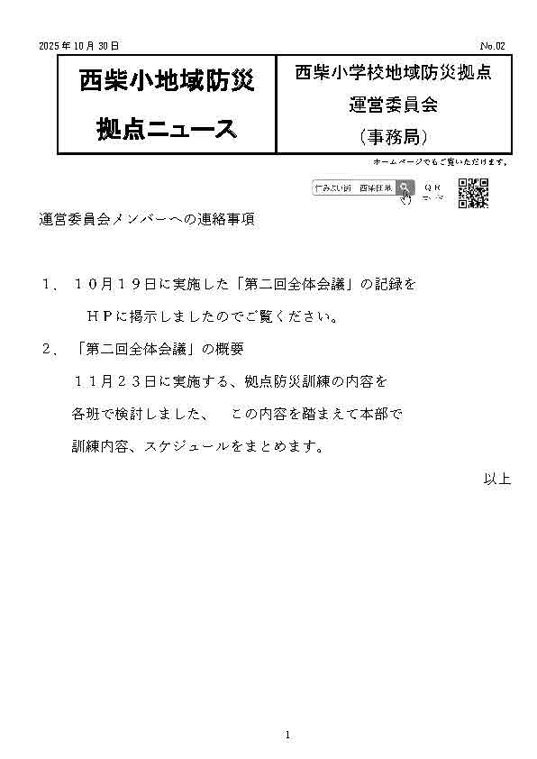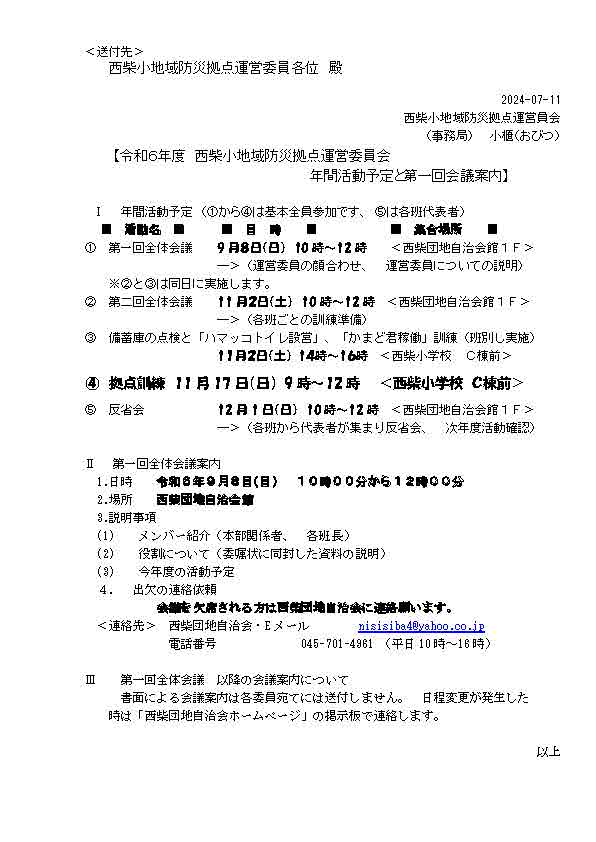 (09/05掲載) 西柴小地域防災拠点運営委員会 年間活動予定と第一回会議案内を掲載しました。