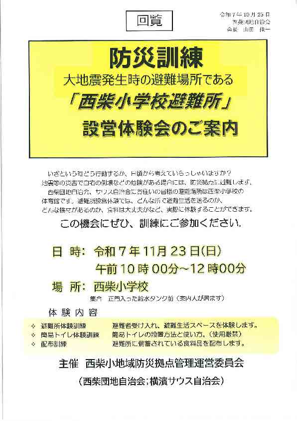 ● 拠点訓練 11月19日(日)10時~12時 <西柴小学校 C棟前>