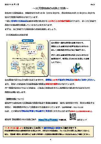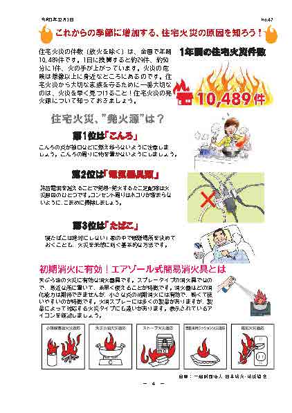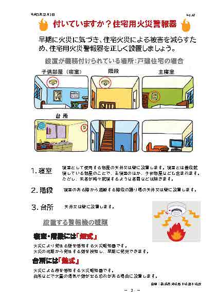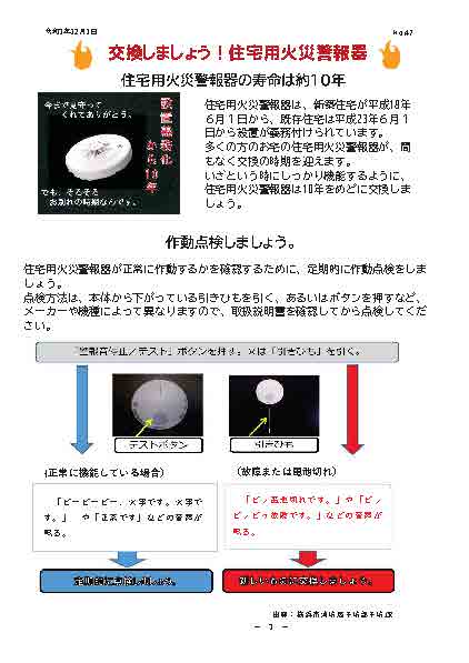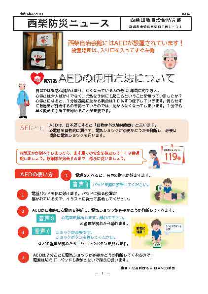 西柴団地、安全・安心な街目指して、住みよい街西柴団地 西柴防災ニュース47号を発行しました。今回のテーマは: AEDの使用方法、住宅火災報知器の確認をしてください、付いていますか住宅火災報知器、住宅火災報知器交換しましょう、住宅火災の原因についてなどが細かく説明されています。