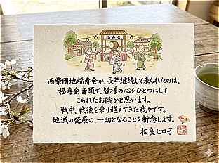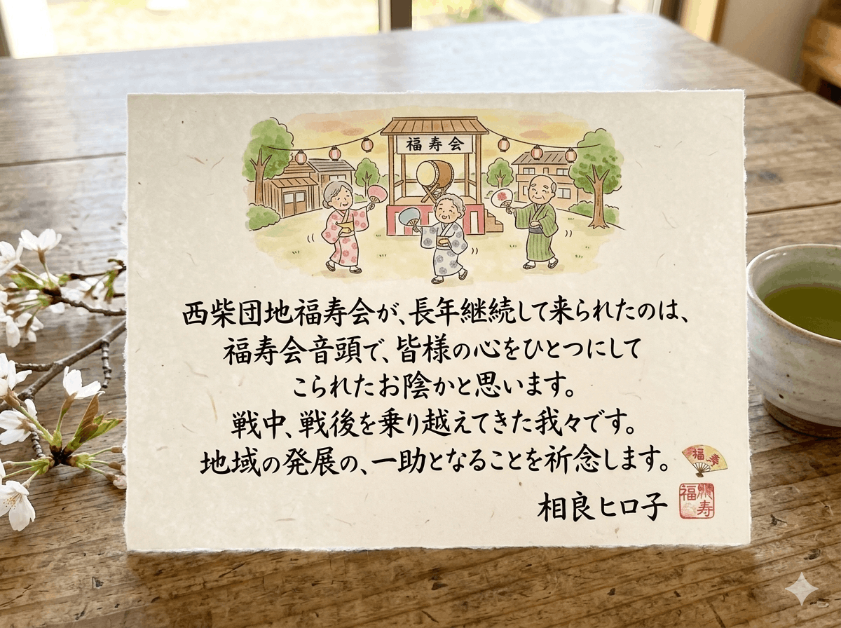 『西柴団地福寿会が、長年継続して来られたのは、福寿会音頭で、皆様の心をひとつにしてこられたお陰かと思います。戦中、戦後を乗り越えてきた我々です。地域の発展の、一助となることを祈念します。