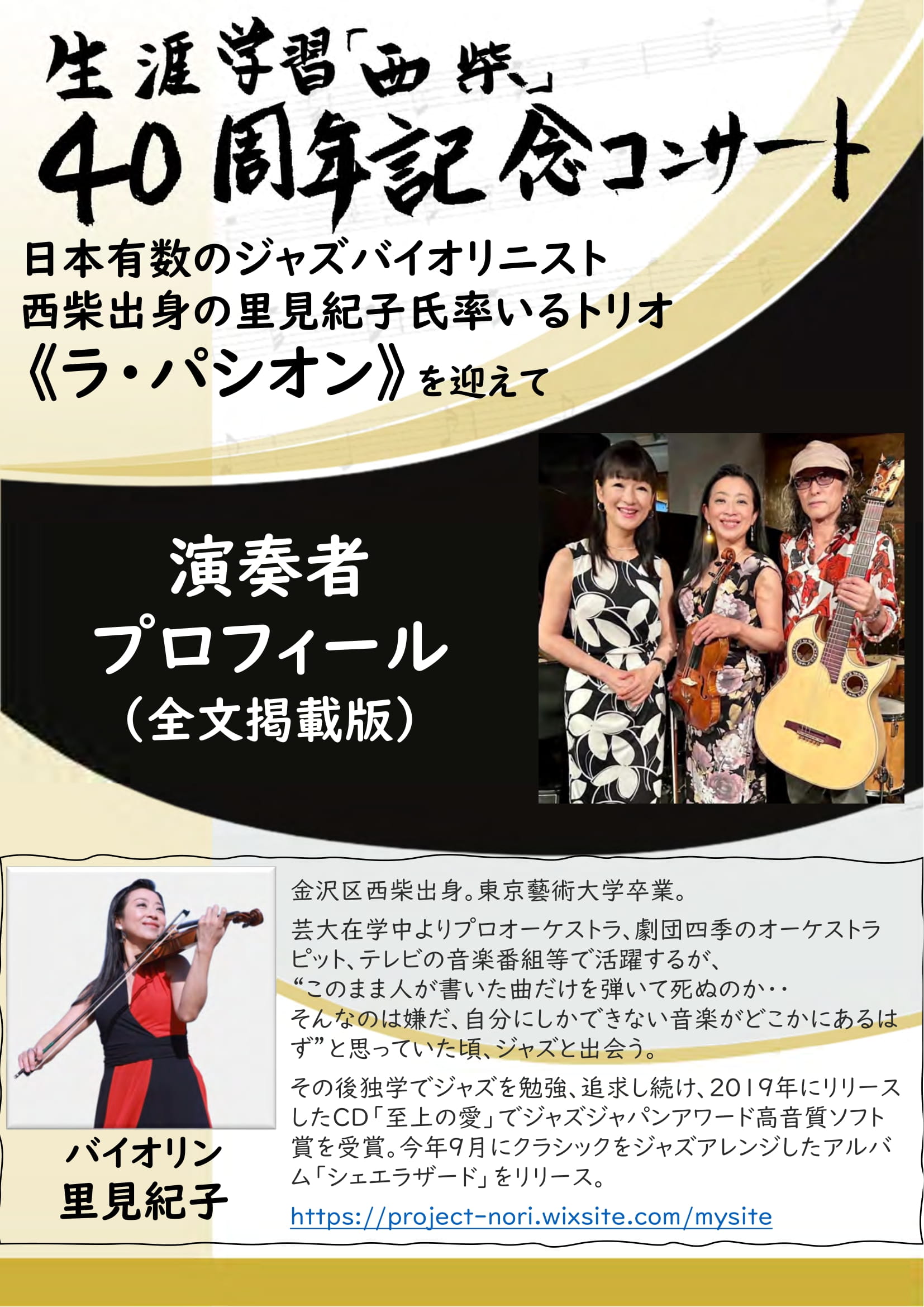 9月23日開催の生涯学習「西柴」40周年記念コンサートで 配付したプログラムでは、 紙幅の都合上、演奏者プロフィールを すべて載せることはできませんでした。
