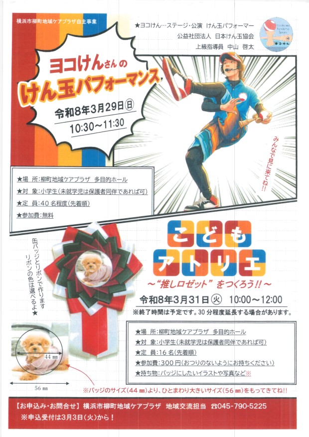 ヨコけんさんのけん玉パフォーマンス 3月29日(日) 10:30 11:30 柳町地域ケアプラザ 多目的ホール |