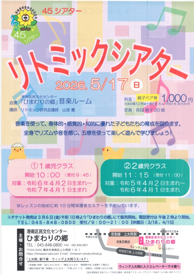 リトミックシアター 5月17日 ①10:00 ②11:15 港南区民文化センター ひまわりの郷 |