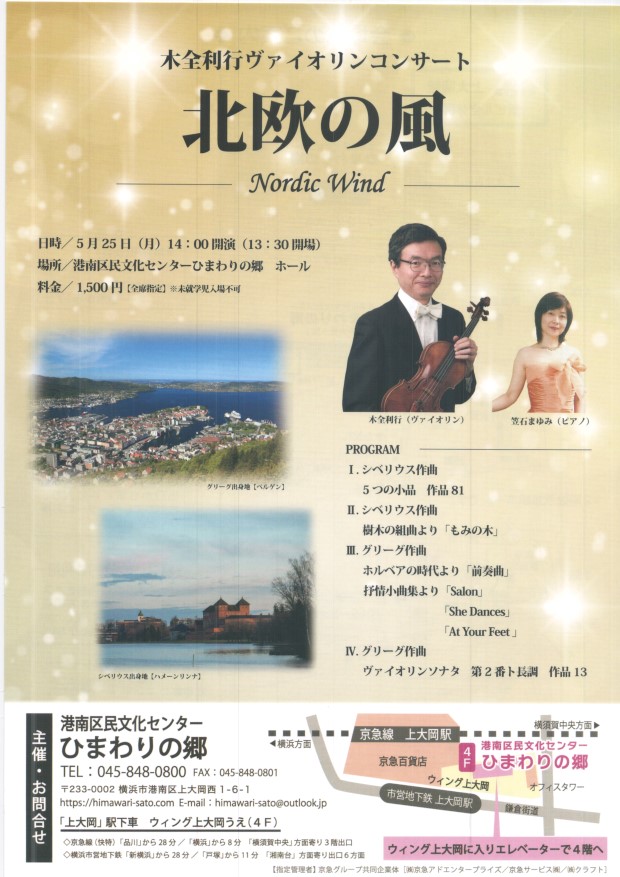 北欧の風 ヴァイオリンコンサート 5月25日(月) 14時から 港南区民文化センターひまわりの郷 |