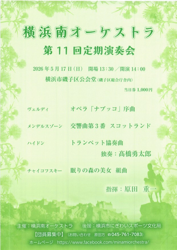 横浜南オーケストラ 第11回定期演奏会 5月17日(日) 14時から 磯子区公会堂 |