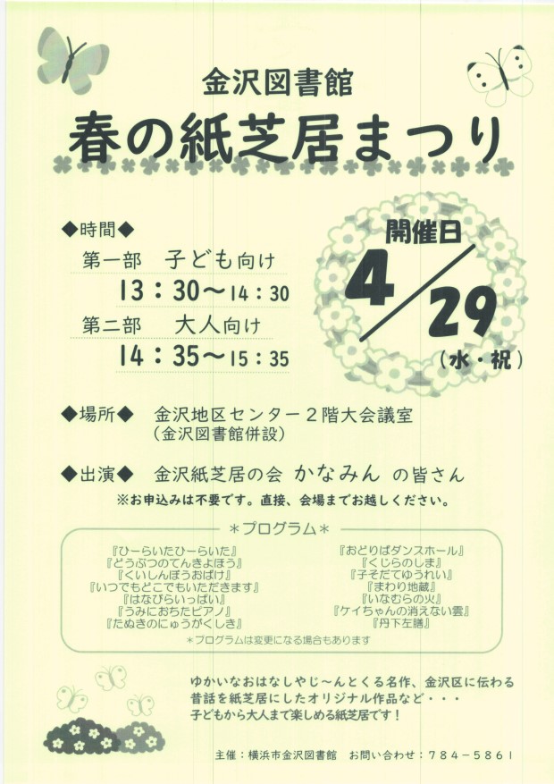 春の紙芝居まつり 4月29日 131時30分 金沢地区センター |
