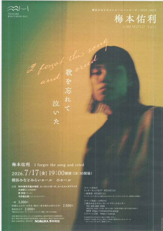梅本佑利 歌を忘れて泣いた 7月17日 19時 みなとみらい小ホール |